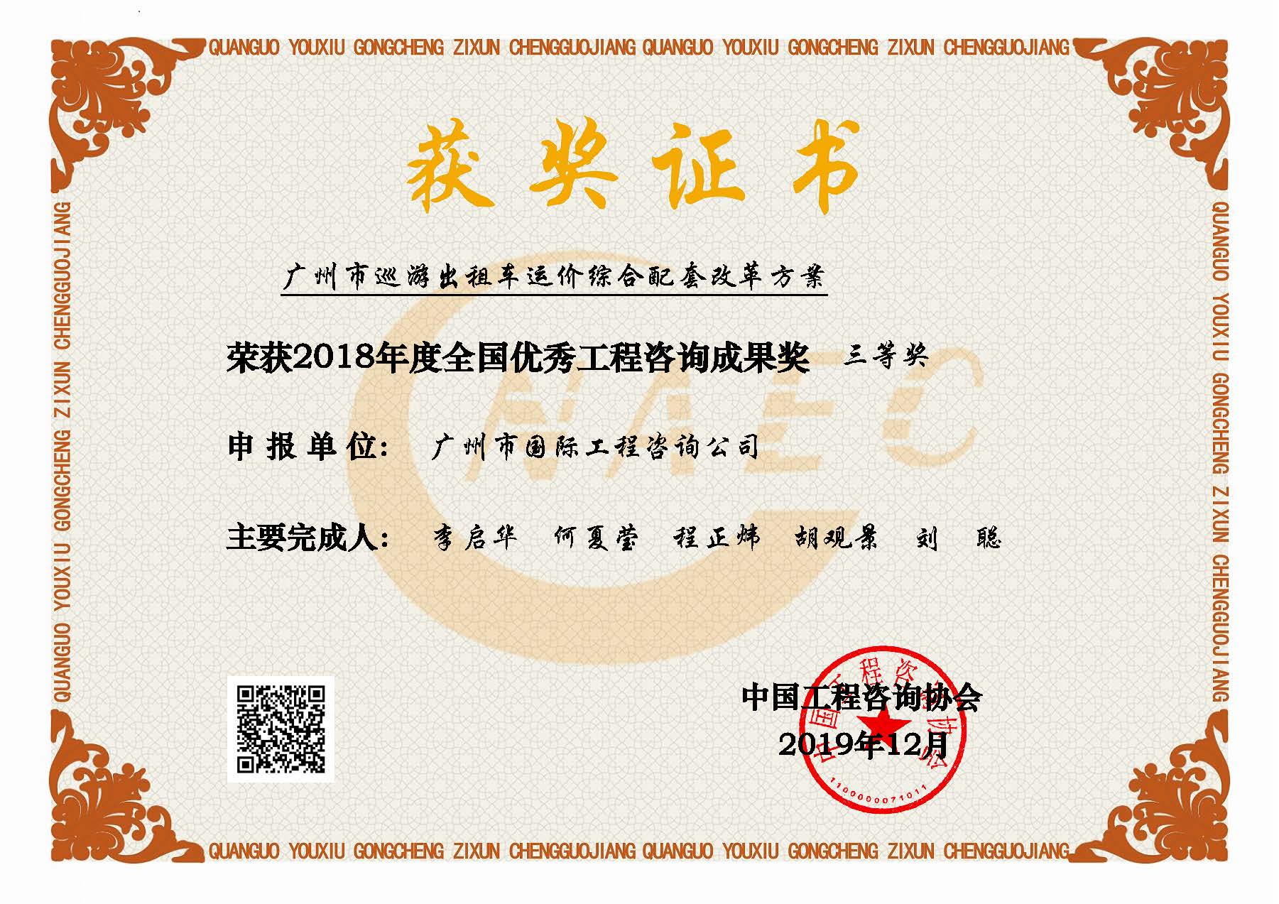 2018年度全國優(yōu)秀工程咨詢成果三等獎(廣州市巡游出租車運價...