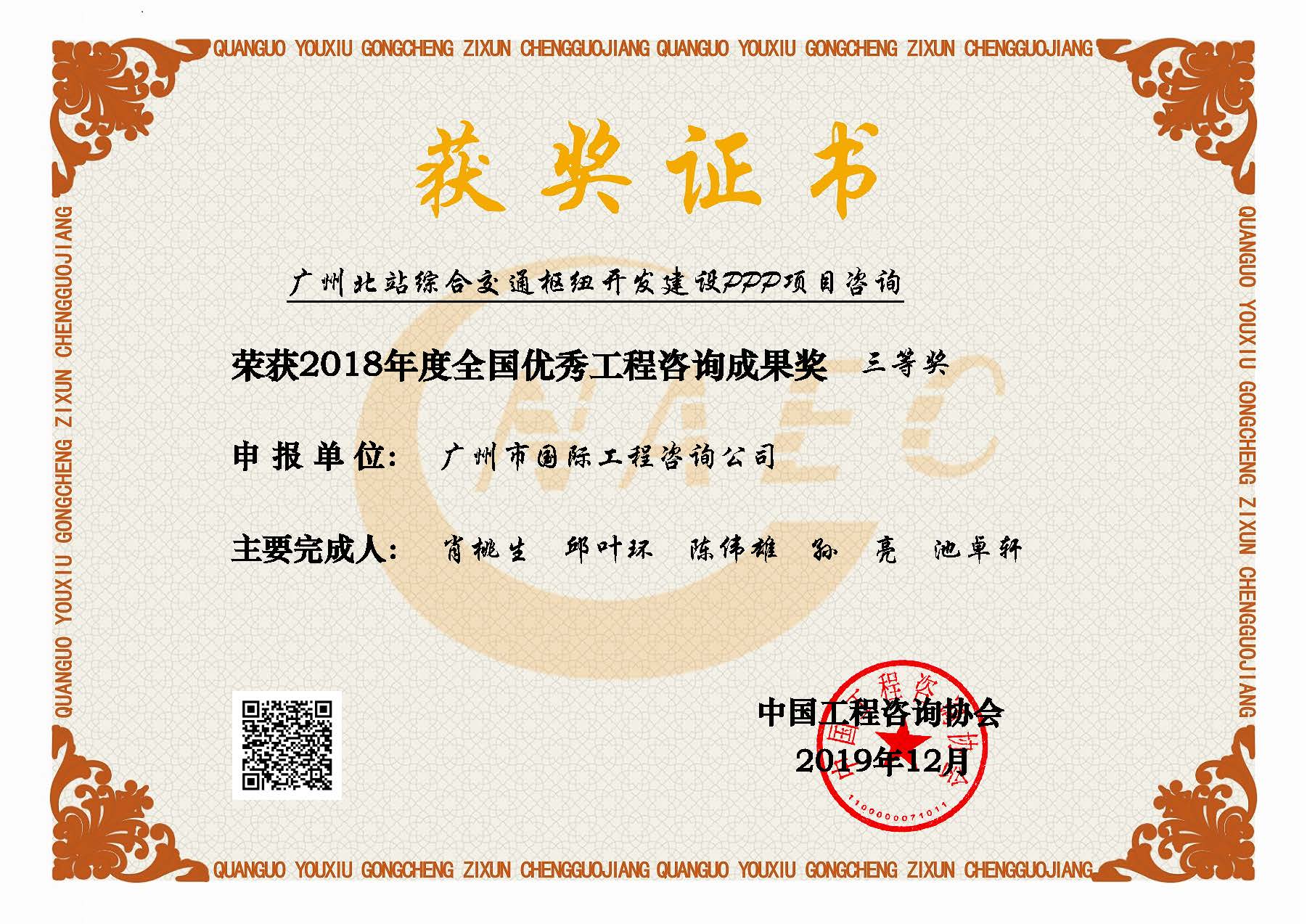 2018年度全國優(yōu)秀工程咨詢成果三等獎(廣州北站綜合交通樞紐...