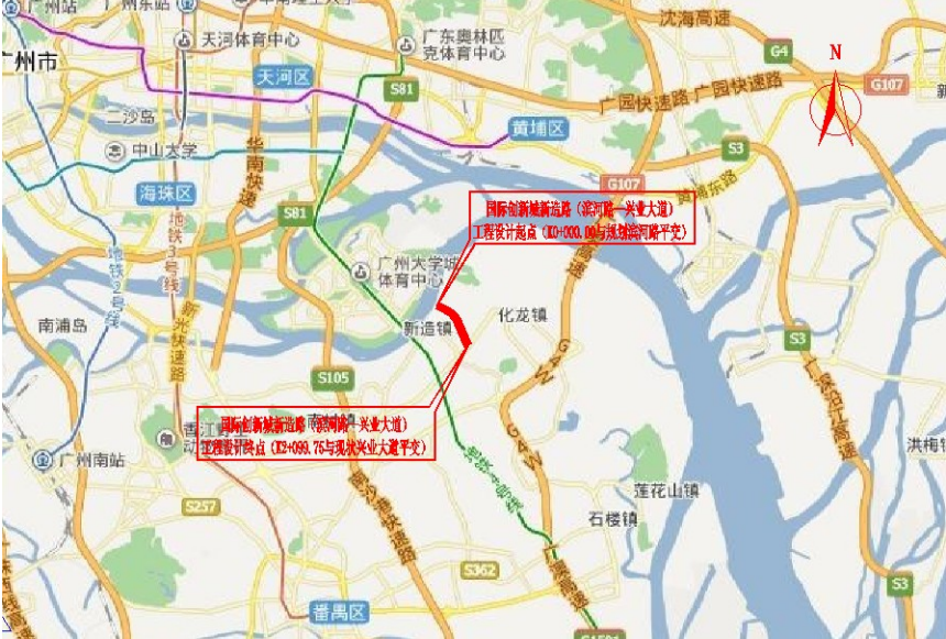 國際創(chuàng)新城新造路(濱河路—興業(yè)大道)工程位于番禺區(qū)新造鎮(zhèn)大學城南岸國際創(chuàng)新城啟動區(qū),北起濱河路,南至興業(yè)大道,路線基本呈南北走向,道路設(shè)計全長約 2.1km,道路規(guī)劃為城市次干路,規(guī)劃紅線標準段寬度為 40m,部分展寬段寬度分別為 45m、50m。項目建設(shè)內(nèi)容包括道路、涵洞、照明、交通、市政管網(wǎng)及景觀綠化工程等。根據(jù)道路建設(shè)需要,征收土地面積99067.05平方米。