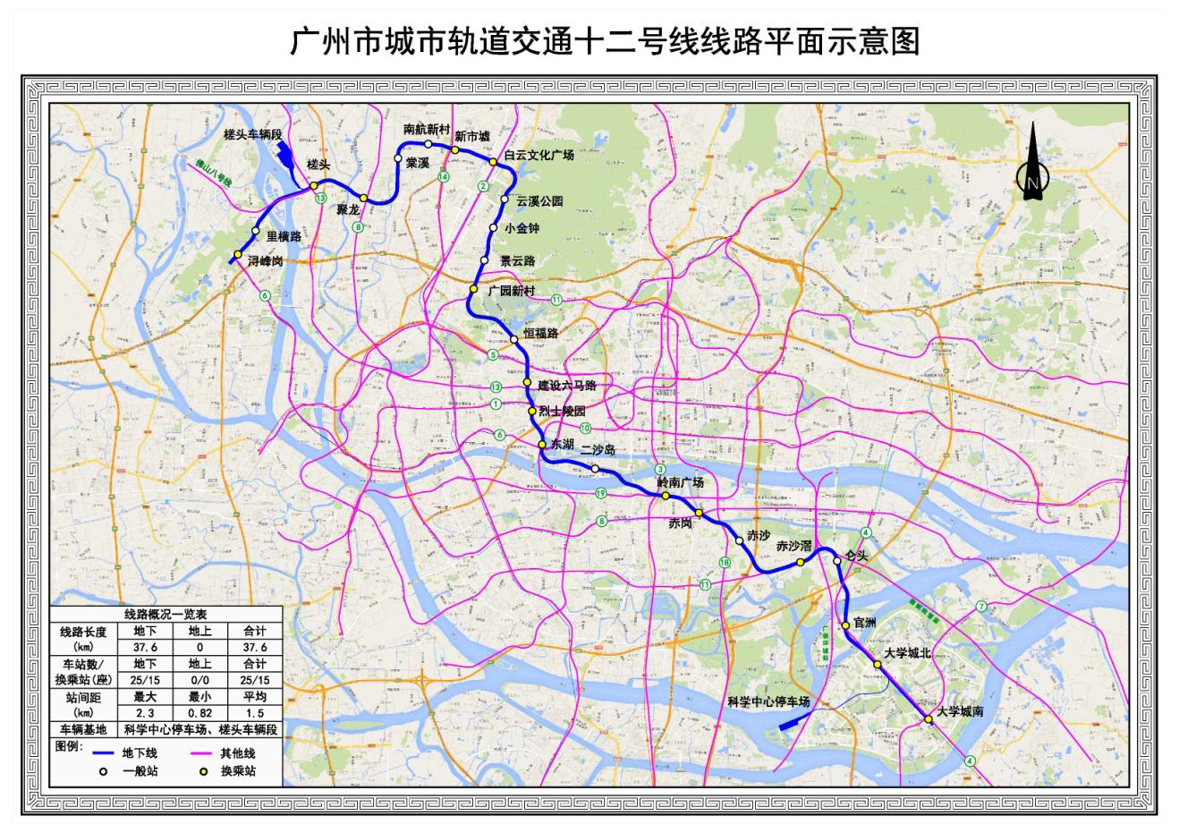 項(xiàng)目規(guī)模:線路全長37.6km,全為地下線;設(shè)站25座,其中換乘站15座。最大站間距2.34km(廣園新村~恒福路區(qū)間),最小站間距0.82km(南航新村~新市墟站),平均站間距1.5km。全線設(shè)置一段一場,分別為槎頭車輛段和和科學(xué)中心停車場。投資估算:382.41億元。