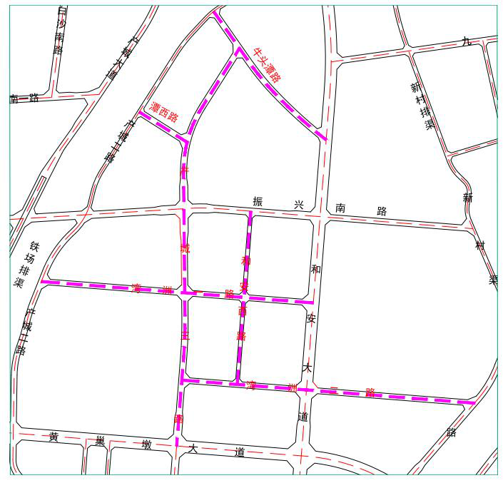 1、牛頭潭路:道路等級(jí)為城市次干路,道路紅線長(zhǎng)715m 紅線寬度為26m,雙向4 車道,設(shè)計(jì)車速為40km/h,混凝土路面結(jié)構(gòu)。