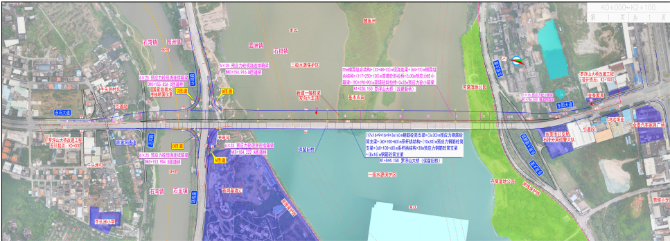 羅浮山大橋改建工程推薦采用保留改建方案,路線起點 K0+000 接順惠州市博羅縣石灣鎮(zhèn)橋北側永石大道的舊路中線位置處,之后向東側偏出,平行于舊橋呈南北分布依次跨過沙河及東江,在東莞側設計線逐漸靠近舊路中線,并與原引道段接順拼寬落地,之后路線終點位置 K2+100 接順東莞側東園大道,另外在橋梁北側設置四條上下橋匝道 A、B、C、D,位于東江與沙河之間接既有雙向四車道環(huán)島路。項目主線全長約 2.1km。