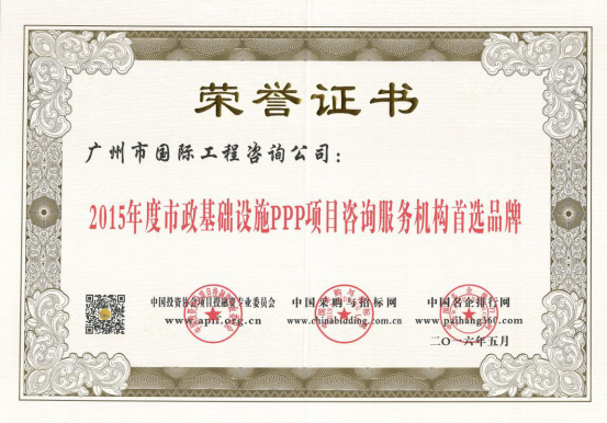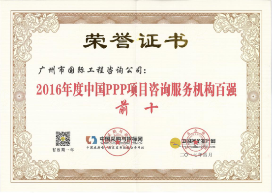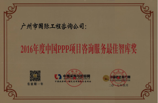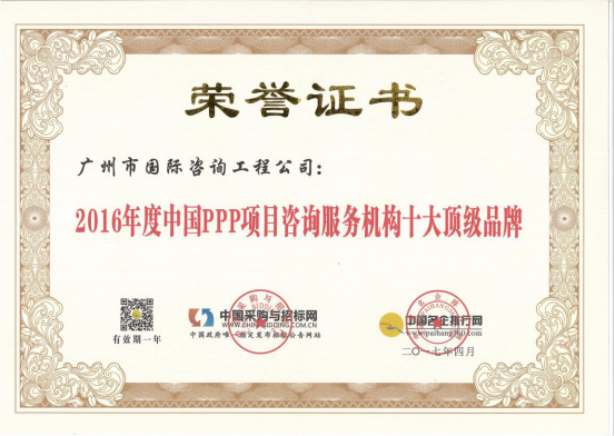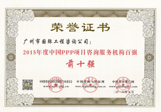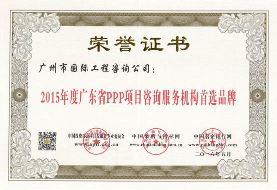 廣州市國際工程咨詢公司已連續(xù)兩年,蟬聯(lián)年度中國PPP項目咨詢服務機構(gòu)十大頂級品牌等獎項。