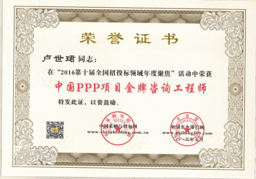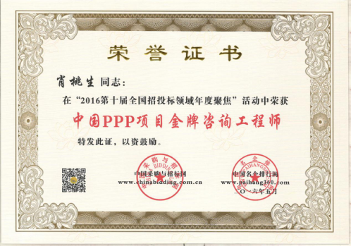 為在PPP咨詢行業(yè)內(nèi)樹立標桿企業(yè),國家發(fā)改委中國投資協(xié)會項目投融資專業(yè)委員會、中國采購與招標網(wǎng)、中國名企排行網(wǎng)聯(lián)合主辦了“第10、11屆PPP咨詢服務機構(gòu)評價推薦”活動。秉承“公開、公平、公正、誠實信用”的原則,最終遴選出年度中國PPP咨詢服務機構(gòu)類大獎。在活動中,廣州市國際工程咨詢公司榮獲“2015、2016年度中國PPP項目咨詢服務機構(gòu)百強(前十強)”,”2016年度中國PPP項目咨詢服務機構(gòu)十大頂級品牌”、”2016年度中國PPP項目咨詢服務最佳智庫獎”、”2015年度廣東省PPP項目咨詢服務機構(gòu)首選品牌”、”2015年度市政基礎(chǔ)設(shè)施PPP項目咨詢服務機構(gòu)首選品牌”等集體榮譽類大獎。此外,公司PPP項目咨詢中心主任肖桃生、副主任盧世君、陳偉雄、孫亮分別榮獲2015、2016年度中國PPP項目金牌咨詢工程師稱號。