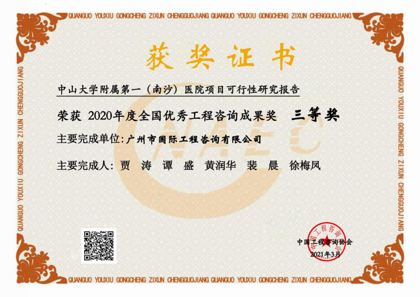 圖2:《中山大學(xué)附屬第一(南沙)醫(yī)院項(xiàng)目可行性研究報(bào)告》獲獎(jiǎng)證書(shū)