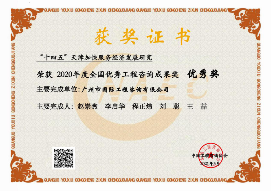 近日,中國(guó)工程咨詢(xún)協(xié)會(huì)公布了2020年度全國(guó)優(yōu)秀工程咨詢(xún)成果獎(jiǎng)評(píng)選結(jié)果,經(jīng)過(guò)單位申報(bào)、初審單位初評(píng)、中國(guó)工程咨詢(xún)協(xié)會(huì)組織專(zhuān)家終審和社會(huì)公示等程序,廣州市國(guó)際工程咨詢(xún)有限公司編制完成的《廣州市本級(jí)政府投資項(xiàng)目建設(shè)用地費(fèi)課題研究報(bào)告》《中山大學(xué)附屬第一(南沙)醫(yī)院項(xiàng)目可行性研究報(bào)告》和《“十四五”天津加快服務(wù)經(jīng)濟(jì)發(fā)展研究》三個(gè)項(xiàng)目,分別榮獲2020年度全國(guó)優(yōu)秀工程咨詢(xún)成果獎(jiǎng)二等獎(jiǎng)、三等獎(jiǎng)和優(yōu)秀獎(jiǎng)。