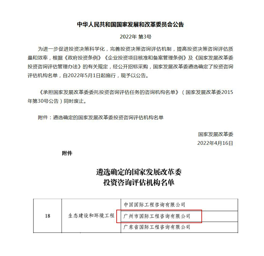 2022年4月28日,國家發(fā)展委公布了《遴選確定的國家發(fā)展改革委投資咨詢評估機構(gòu)名單》(中華人民共和國國家發(fā)展和改革委員會公告2022年第3號),廣州市國際工程咨詢有限公司(以下簡稱“廣州國際咨詢公司”)成功入選“生態(tài)建設(shè)和環(huán)境工程專業(yè)”3家投資咨詢評估機構(gòu)之一。本次遴選共涉及19個專業(yè),全國范圍內(nèi)共有37家咨詢機構(gòu)入選。廣州國際咨詢公司是入選單位中少數(shù)幾家地方性咨詢機構(gòu)之一。