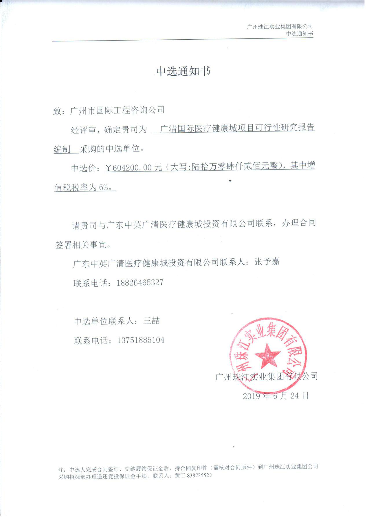 6月19日,廣州珠江實業(yè)集團(tuán)有限公司對廣清國際醫(yī)療健康城項目可行性研究報告采購進(jìn)行邀請招標(biāo),經(jīng)評委評審,確定廣州市國際工程咨詢公司為該項目的中選單位。