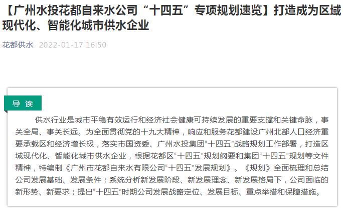 2022年1月17日,廣州市國際工程咨詢有限公司(下稱“廣州國際咨詢公司”)負(fù)責(zé)編制的廣州市花都自來水有限公司“十四五”發(fā)展規(guī)劃項(xiàng)目(以下簡稱“規(guī)劃”)正式印發(fā)實(shí)施,與此同時(shí),業(yè)主單位廣州水投花都自來水公司在其官方微信號公開發(fā)布“十四五”專項(xiàng)規(guī)劃速覽。