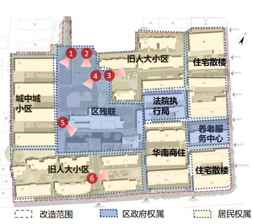 花都區(qū)舊人大小區(qū)建于80-90年代,小區(qū)改造用地面積約35800平方米,建筑總面積約65972平方米,樓棟數30棟,居民戶數719戶,無業(yè)委會與物業(yè)單位。小區(qū)地塊內部組成復雜,包括舊人大小區(qū)、城中城小區(qū)、區(qū)殘聯、法院執(zhí)行局、舊人大辦公樓、華南商住、養(yǎng)老服務中心及住宅散樓等。花都區(qū)舊人大小區(qū)具有黨建文化氛圍濃厚、空間充足以及可利用資源基礎良好等優(yōu)勢,適宜作為先行先試的示范項目。2021年3月經花都區(qū)政府同意確定將舊人大小區(qū)項目作為花都區(qū)老舊小區(qū)有機更新項目的示范區(qū)。項目實施內容主要包括新建立體機械停車樓、利用現狀閑置公房改造成鄰里中心、小區(qū)公共空間(美好會客廳)、兒童娛樂設施、信息標識、充電樁、危房加固、智慧設施及藝術彩繪。